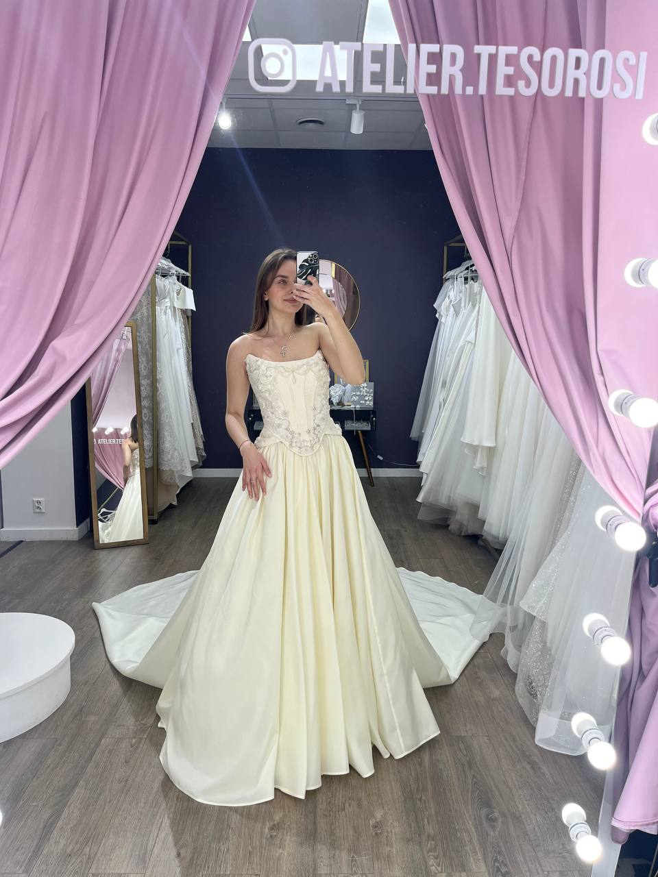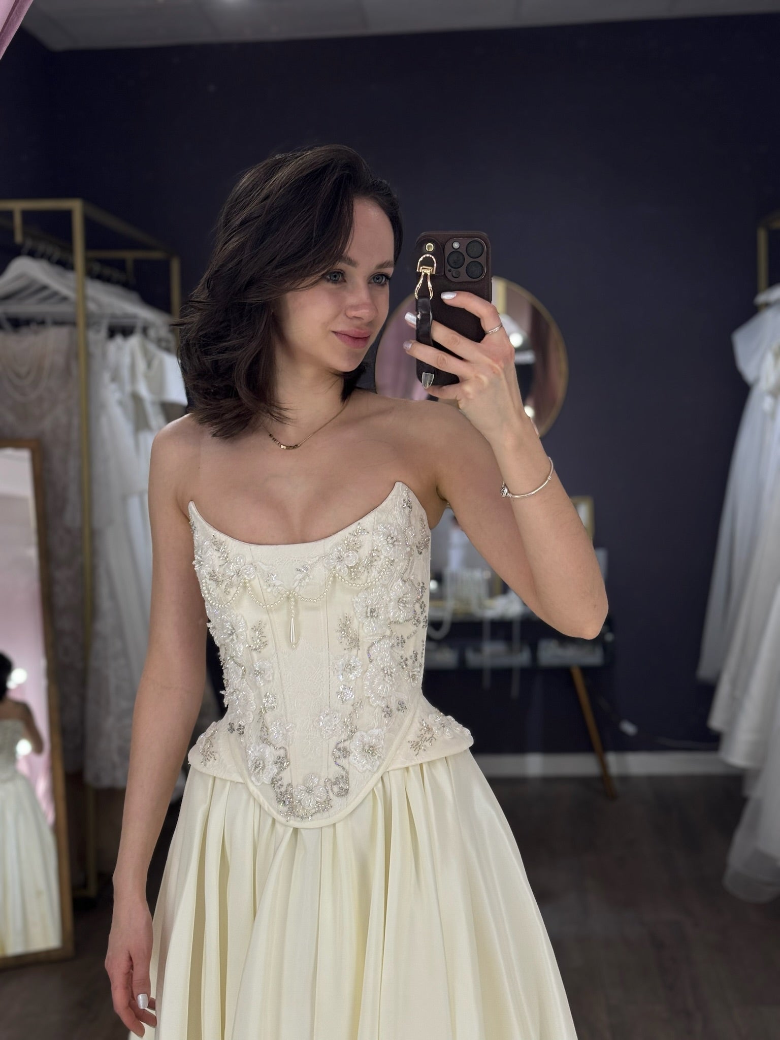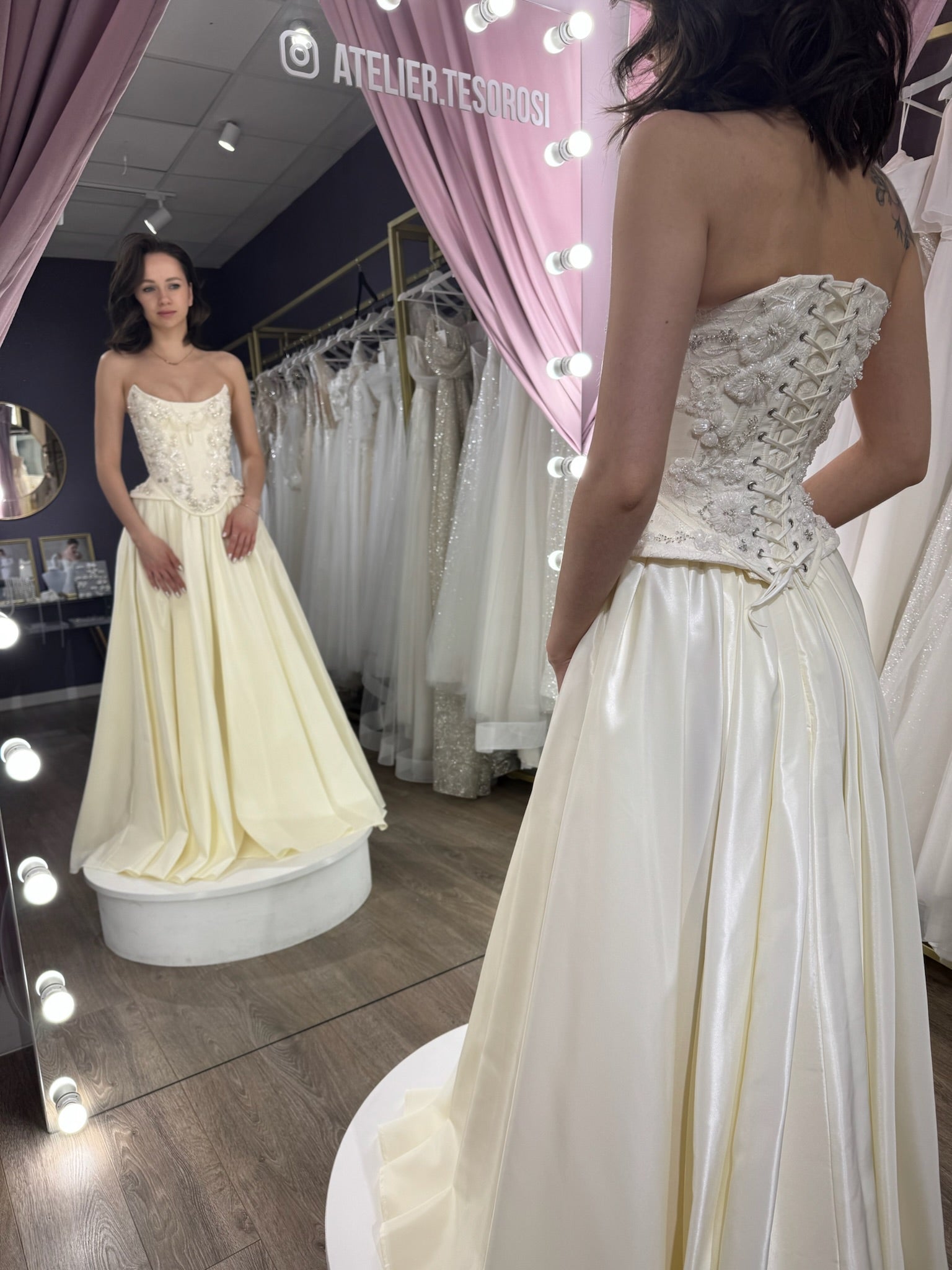 An elegant wedding set that combines refined luxury with modern style. The fashionable corset with a peplum, meticulously hand-embroidered with 3D flowers, adds a delicate and voluminous touch to the look, while luxurious pearl accents give it an incredible elegance. The skirt, featuring a striking slit, is gathered into voluminous, gracefully flowing pleats, creating a light and airy feel. This unique set will perfectly highlight your individuality and transform your wedding day into a fairytale.