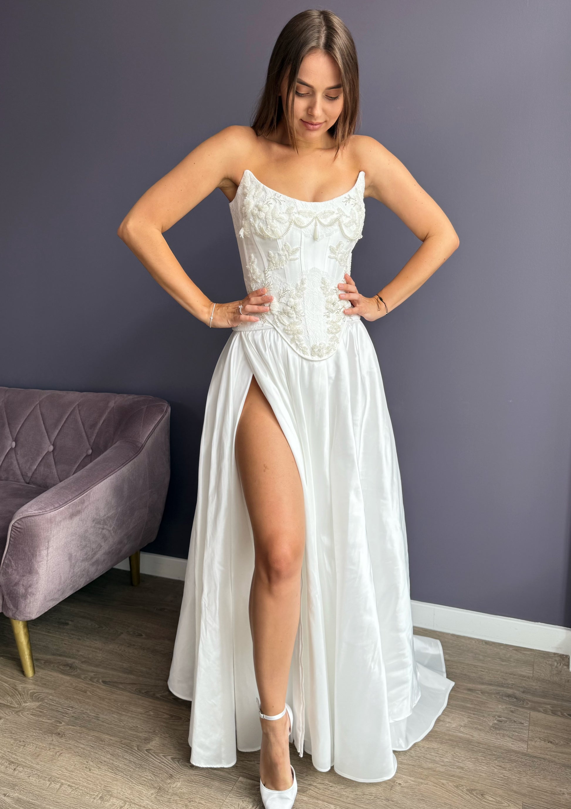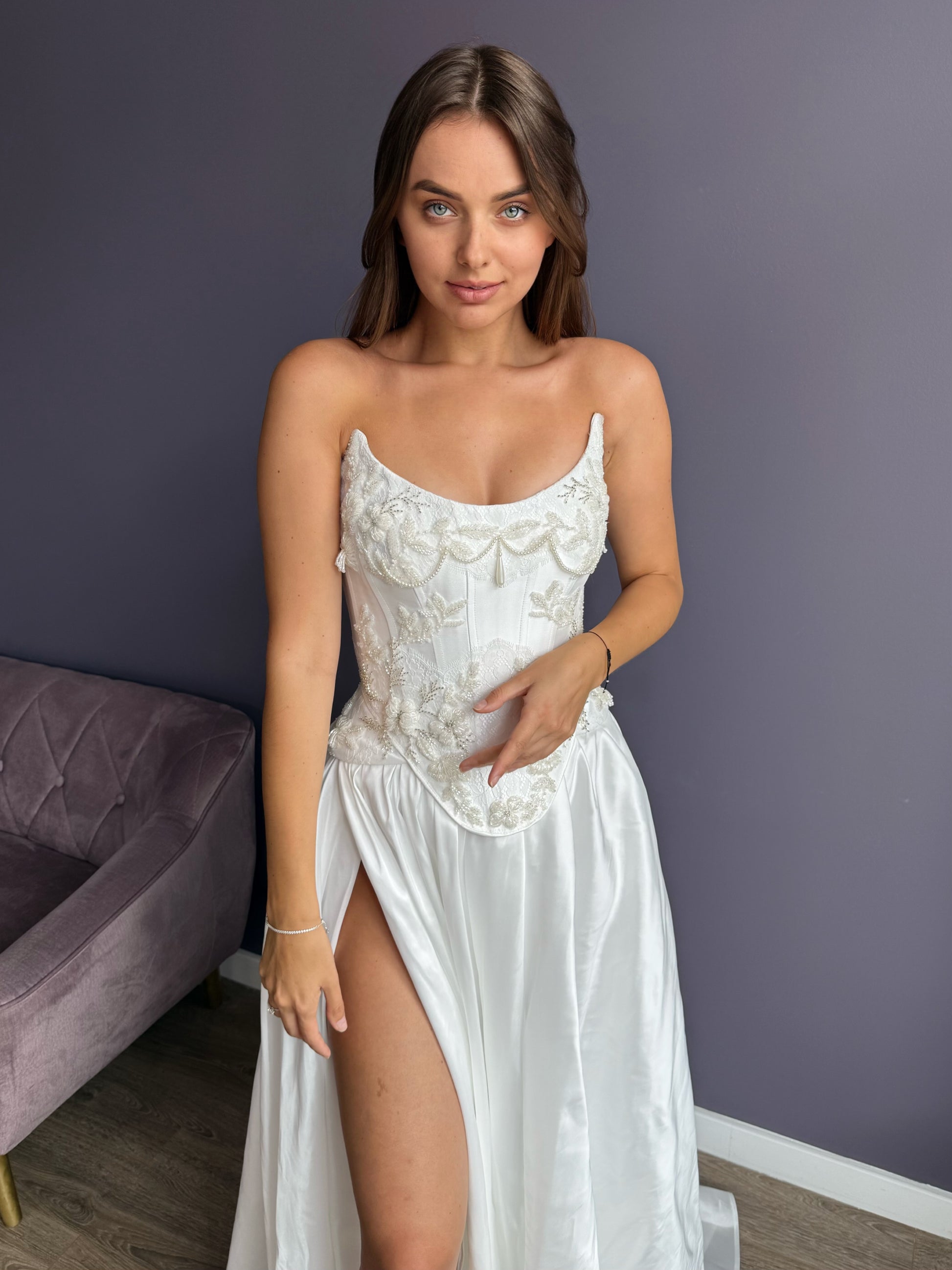 An elegant wedding set that combines refined luxury with modern style. The fashionable corset with a peplum, meticulously hand-embroidered with 3D flowers, adds a delicate and voluminous touch to the look, while luxurious pearl accents give it an incredible elegance. The skirt, featuring a striking slit, is gathered into voluminous, gracefully flowing pleats, creating a light and airy feel. This unique set will perfectly highlight your individuality and transform your wedding day into a fairytale.