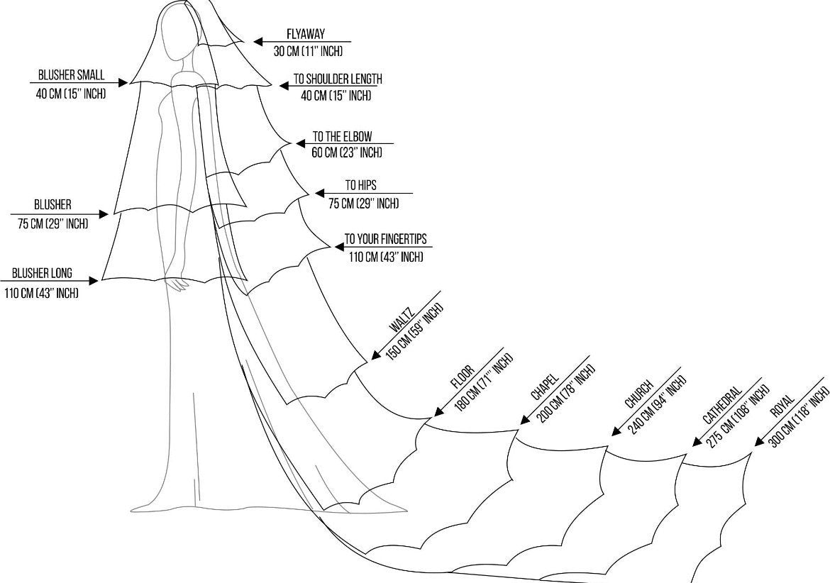 You can choose any type of wedding veil length. We want to note that upon receipt, there may be a difference of up to ±2 cm in the length of the veil from the one ordered due to technical reasons. Also, if you need a veil length different from those specified for selection, choose a longer length and be sure to indicate the required length in the order comments.