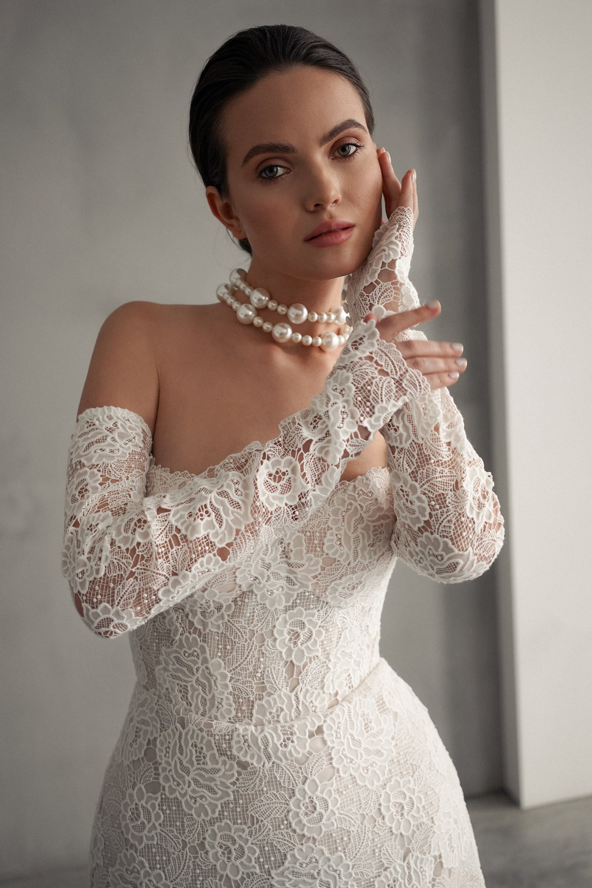 Lace sleeves add tenderness and romance to the dress, creating a unique look that will be remembered for a lifetime. Every seam, every detail of this dress is made with love and attention to the smallest details to highlight the beauty and sophistication of the bride on this special day.