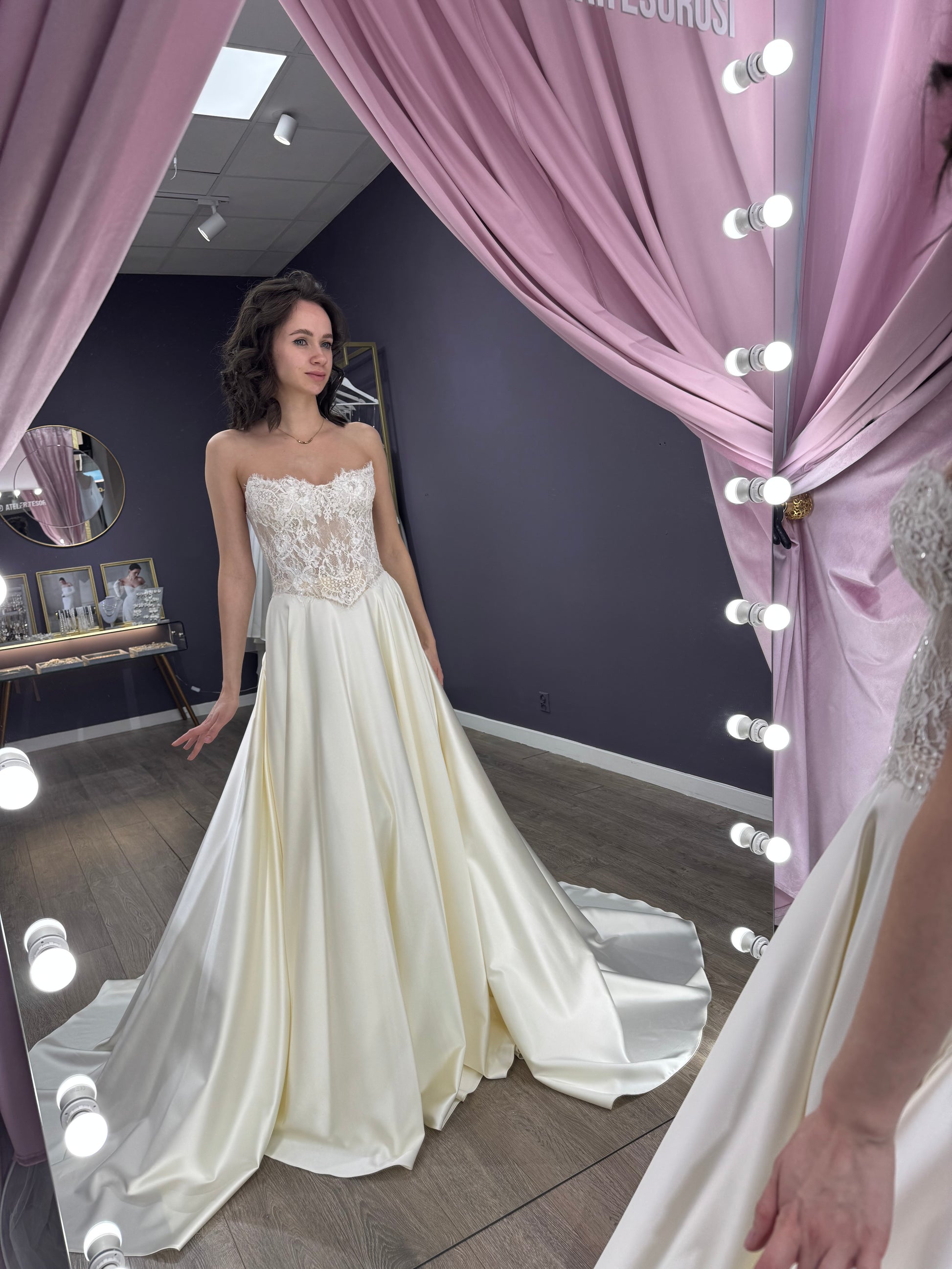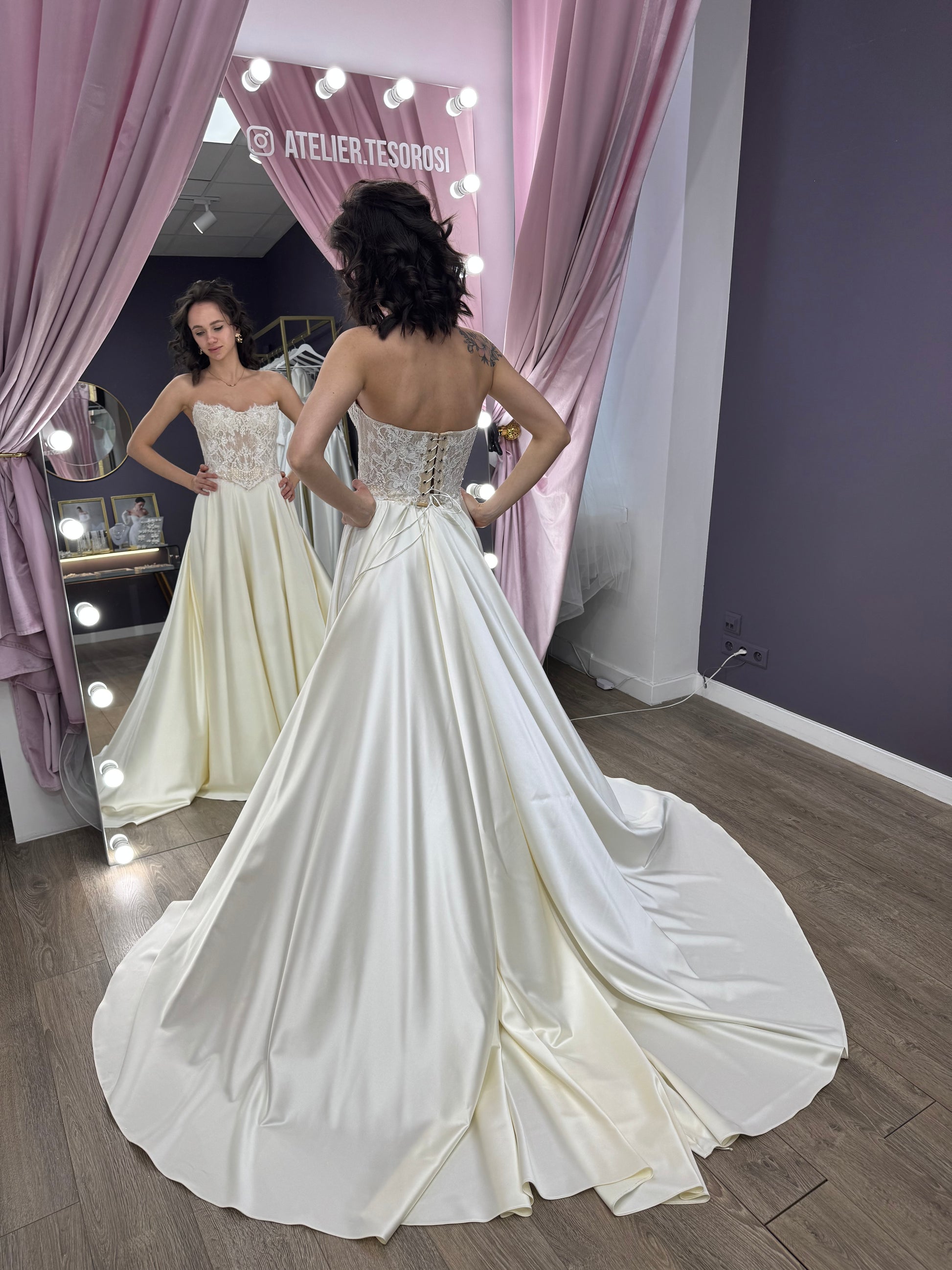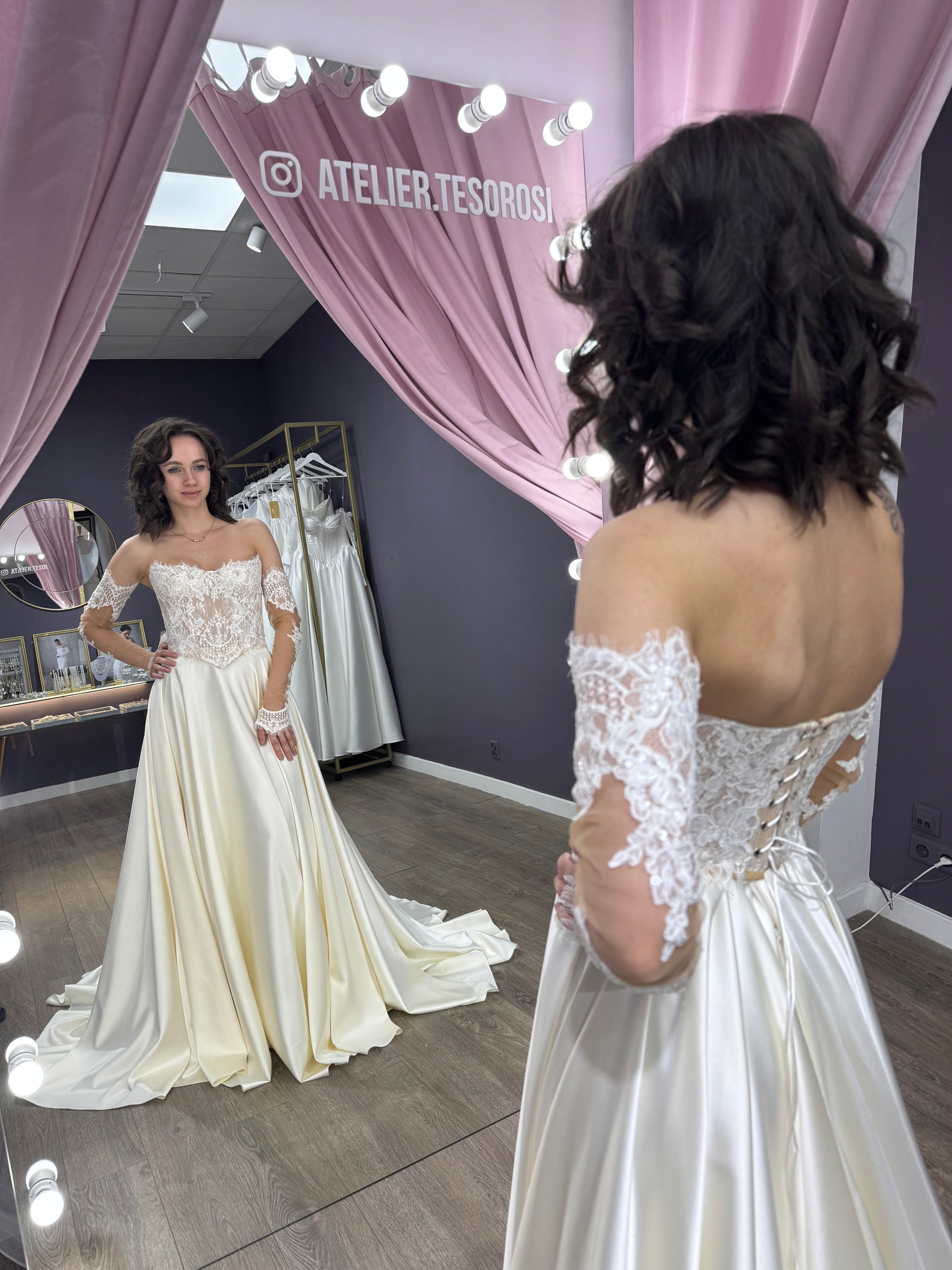 Lace sleeves add tenderness and romance to the dress, creating a unique look that will be remembered for a lifetime. Every seam, every detail of this dress is made with love and attention to the smallest details to highlight the beauty and sophistication of the bride on this special day.
