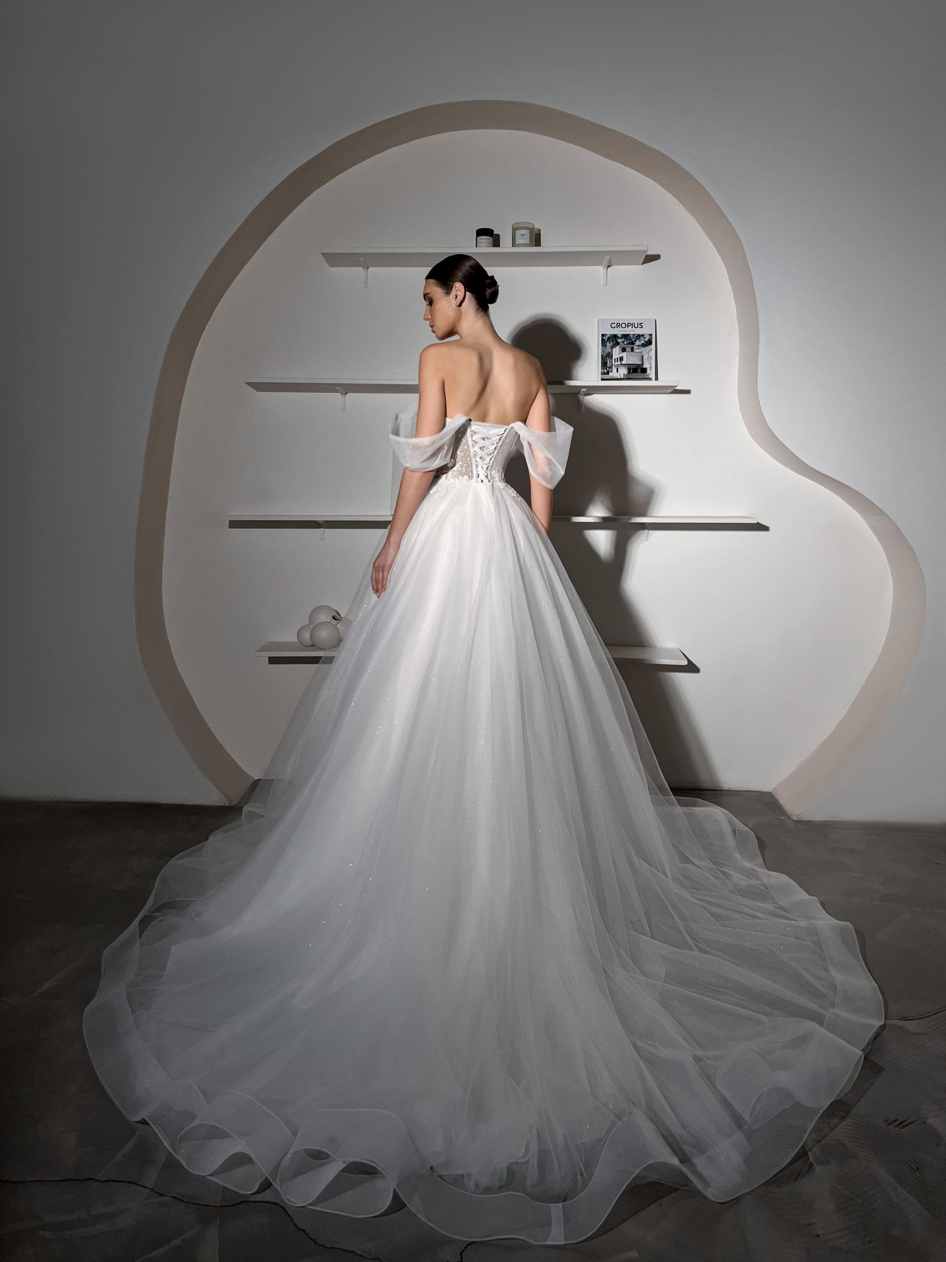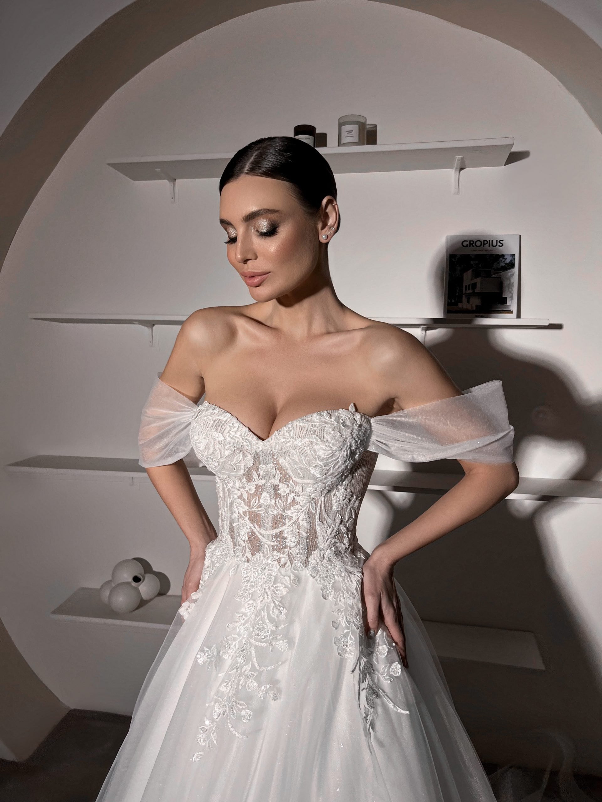 Wedding A-Line Light Enchanted Off-Shoulder Tulle Bridal Gown with Floral Embellishments and Sheer Overlay, Lace corset